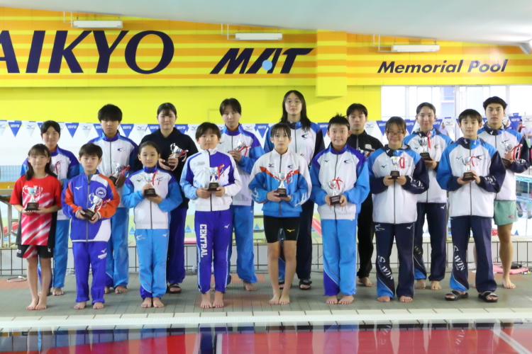 | 2025年11月9日(日)、大教SS・MAT記念プールで行われた『第44回埼玉県SCジュニアカップ秋季水泳競技大会』において、優秀選手として選ばれた選手の皆さんです。 |